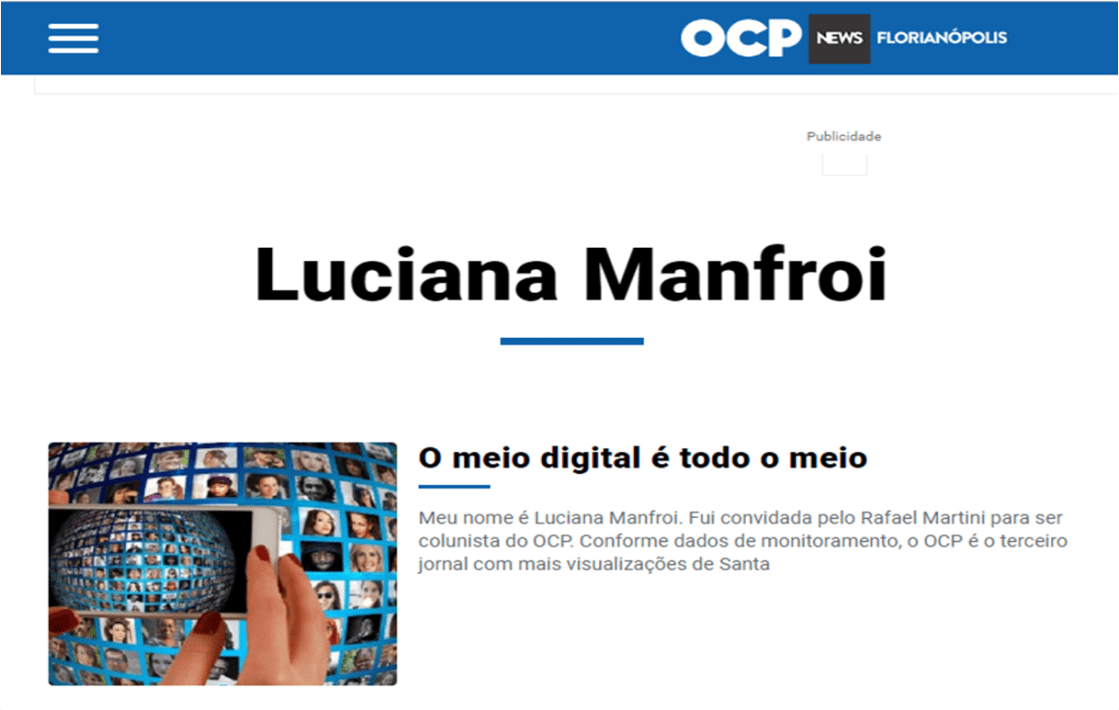 Colunista na área de Marketing Digital, Tecnologia e Inovação no OCP NEWS – o terceiro maior jornal com mais visualizações no Estado de Santa Catarina.