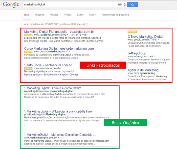 Os resultados para as palavras-chave marketing digital apontam, na parte superior da página, para os links patrocinados pelo Google, indicados em vermelho. Abaixo, em verde, seguem os resultados da busca orgânica do Google para os mesmos termos.