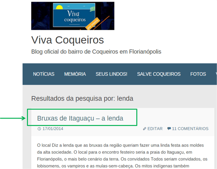 No exemplo acima, podemos analisar que a busca pela “lendas das pedras de Itaguaçu” conseguem satisfazer o usuário que entrou no blog, pois existe conteúdo relacionado a ela.