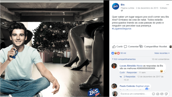 Uma ação do produto Bis, da marca de chocolates Lacta, causou um grande engajamento no Facebook, no início de dezembro de 2015. A imagem mostrava um garoto sentado embaixo de uma mesa, para poder comer o seu Bis Xtra, já que não gostava da ceia servida no Natal.