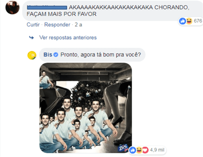 O maior engajamento se deu quando as pessoas comentaram sobre a imagem. Na próxima figura, podemos ver uma pessoa pedindo para o Bis fazer mais sobre essa publicação. A marca entra na brincadeira e o “fazer mais”, sugerido pela pessoa, acaba multiplicando o garoto da propaganda.