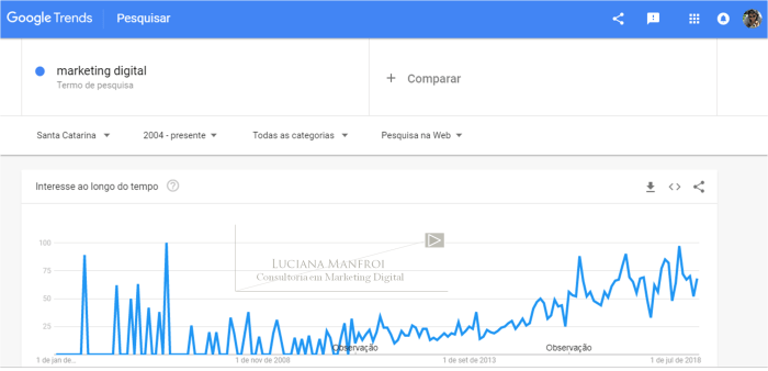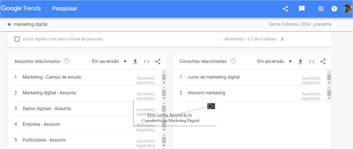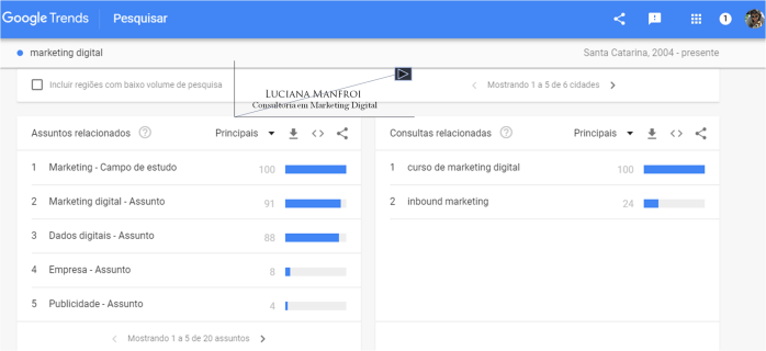 Irei exemplificar com a busca pelo termo marketing digital, com um filtro para Santa Catarina. Acompanhe os resultados nas imagens abaixo, e nas legendas que indicarei em cada uma delas.