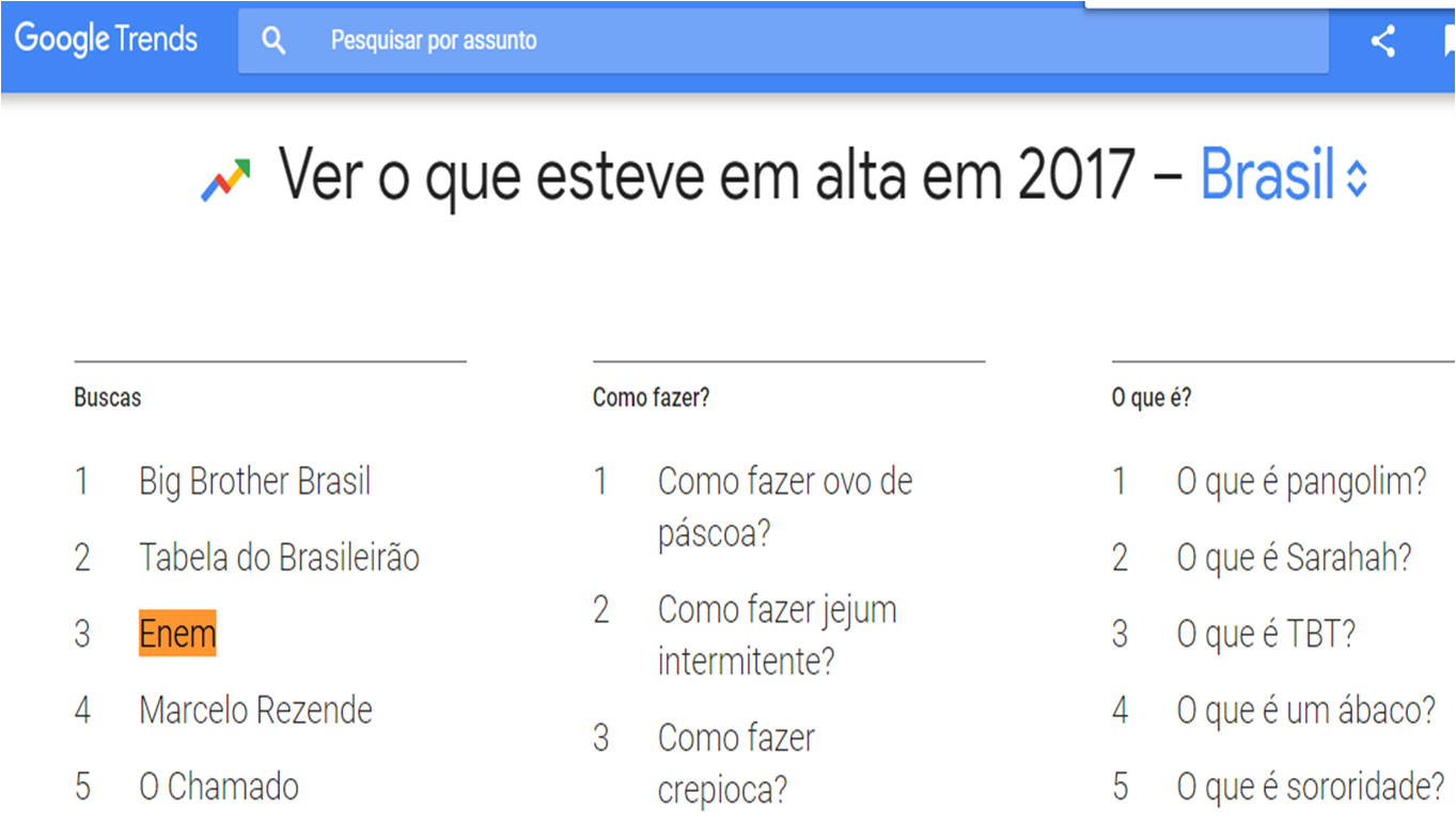 A imagem abaixo mostra que em 2017 o termo de busca ENEM foi o terceiro mais procurado. Portanto, confirmando a minha análise preliminar, quando estava produzindo conteúdo para um website recentemente criado.
