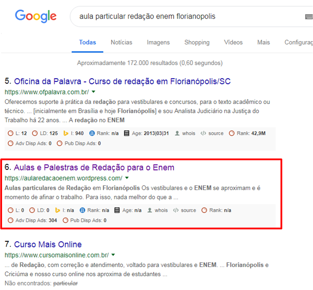 Em 2018 fui contratada para realizar a consultoria para um cliente que necessitava ranqueamento para as seguintes palavras-chave: aula+particular+redação+enem+florianópolis.