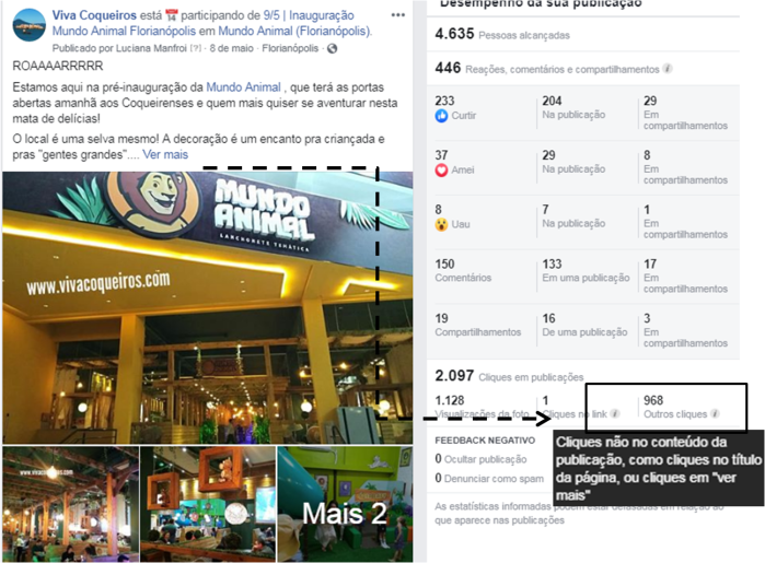 Clicando no ver mais, o texto se expande para a continuação da leitura. Esta expansão gera engajamento, contando que, na mesma publicação, a soma será de mais um clique. O analytics do Facebook mostra esta informação, no quadro em preto, na imagem acima em que foram computados os cliques para a continuidade da leitura em quase 50%.