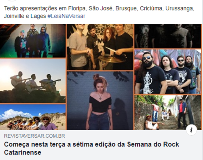 Caso estejamos publicando um tema como um evento, como no exemplo abaixo, a hashtag mais próxima ao público poderia ser #semanarockcatarinense ou, como no Instagram, que se utiliza completamente de hashtag, #7semanarockcatarinense.