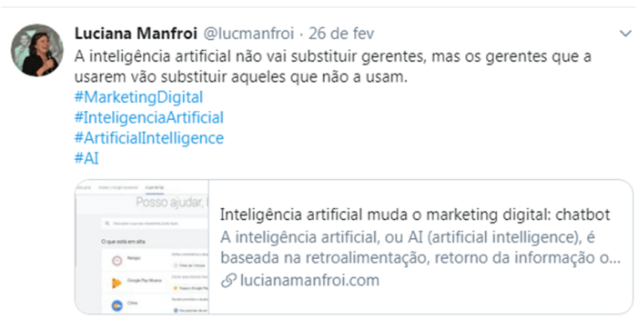 Meu nome é Luciana Manfroi e eu sou consultora, palestrante, professora e escritora na área de Marketing Digital para empresas e profissionais liberais de Santa Catarina.