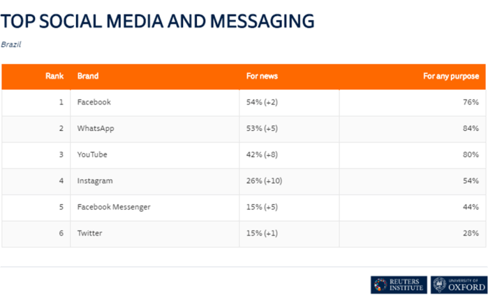 Segundo o Instituto Reuters para o estudo de Jornalismo, em seu Relatório Anual de Notícias Digitais, publicado em junho de 2019, o Brasil é o país que mais se utiliza das mídias sociais.